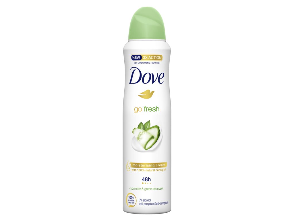 Unikátna vôňa s dlhodobou ochranou proti poteniu! Dámsky antiperspirant v spreji Dove Go Fresh Cucumber & Green Tea obsahuje ¼ hydratačného krému so 100 % prírodným ošetrujúcim olejom, ktorý vašej pokožke dodá starostlivosť pre jemnejšie a hladšie podpazušie. Pokožku upokojuje, hydratuje a zvláčňuje. Okrem starostlivosti jej tiež dodáva 48-hodinovú ochranu proti poteniu a nepríjemnému telesnému zápachu. Dámsky antiperspirant v spreji Dove Go Fresh Cucumber & Green Tea vás presvedčí svojou osviežujúcou vôňou uhorky a zeleného čaju a spoľahlivou ochranou – každý deň!